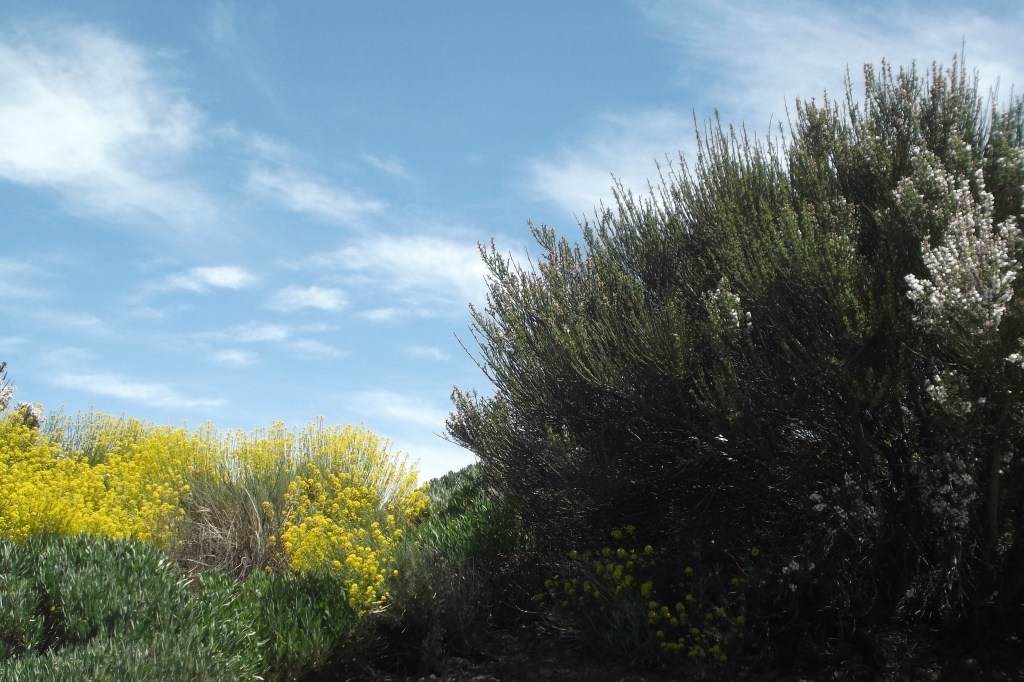 En estos día de mayo la floración es intensa en todos los rincones de la isla, pero sin lugar a dudas en las altas planicies se eleva mucho más esos aromas a tierra, dulzor y retamas. Las abejas ya se disputan los brotes más suculentos porque la naturaleza no tiene secretos para nadie y nos muestra su cara transparente cada vez que la contemplamos. Junto a los pinos canarios que se balancean dejando tras de si el sonido de su voz enmedio del silencio nos atrevemos a decir que la verdad de todo está ahí, en lo más simple a la vez que lo más elaborado. Lienzos de olor y bocanadas de fresca abundancia se despliegan a los pies del Gigante que observa y asiente. Que enamora a la vez que da miedo por su magestuosidad. Querer elaborar un cuadro con estos matices nos llevaría demasiado tiempo, justo hasta la puesta del sol. Mañana será completamente distinto aunque los pinzones azules, las retamas y las violetas no estarán esperando como siempre.